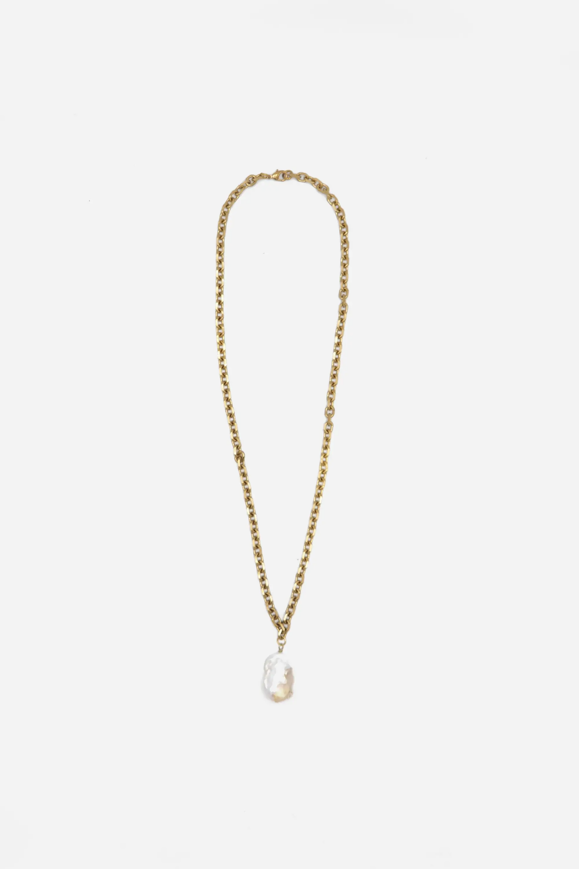 Freshwater pearl drop with a brass chain to compliment any look, from jeans to a night on the town.