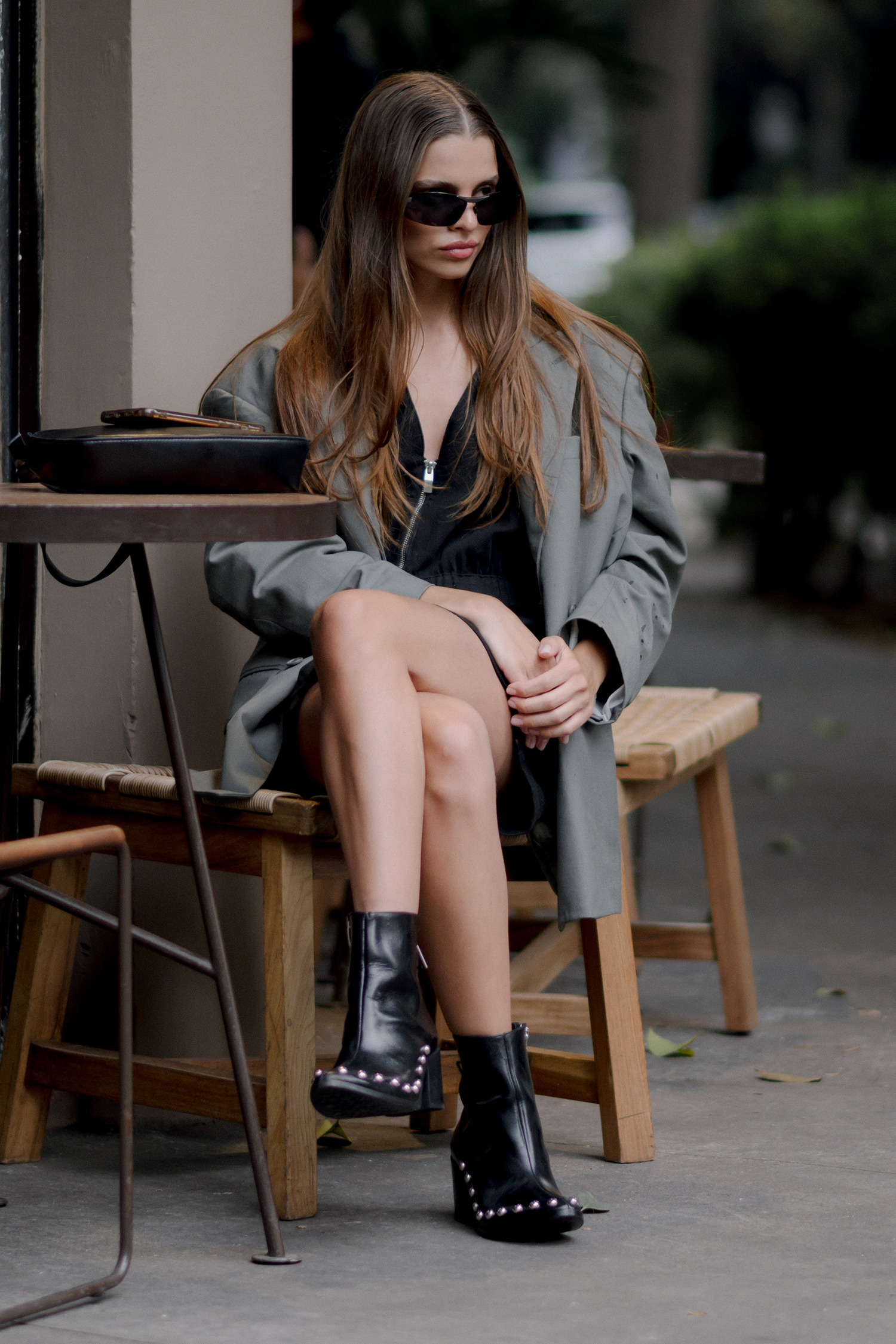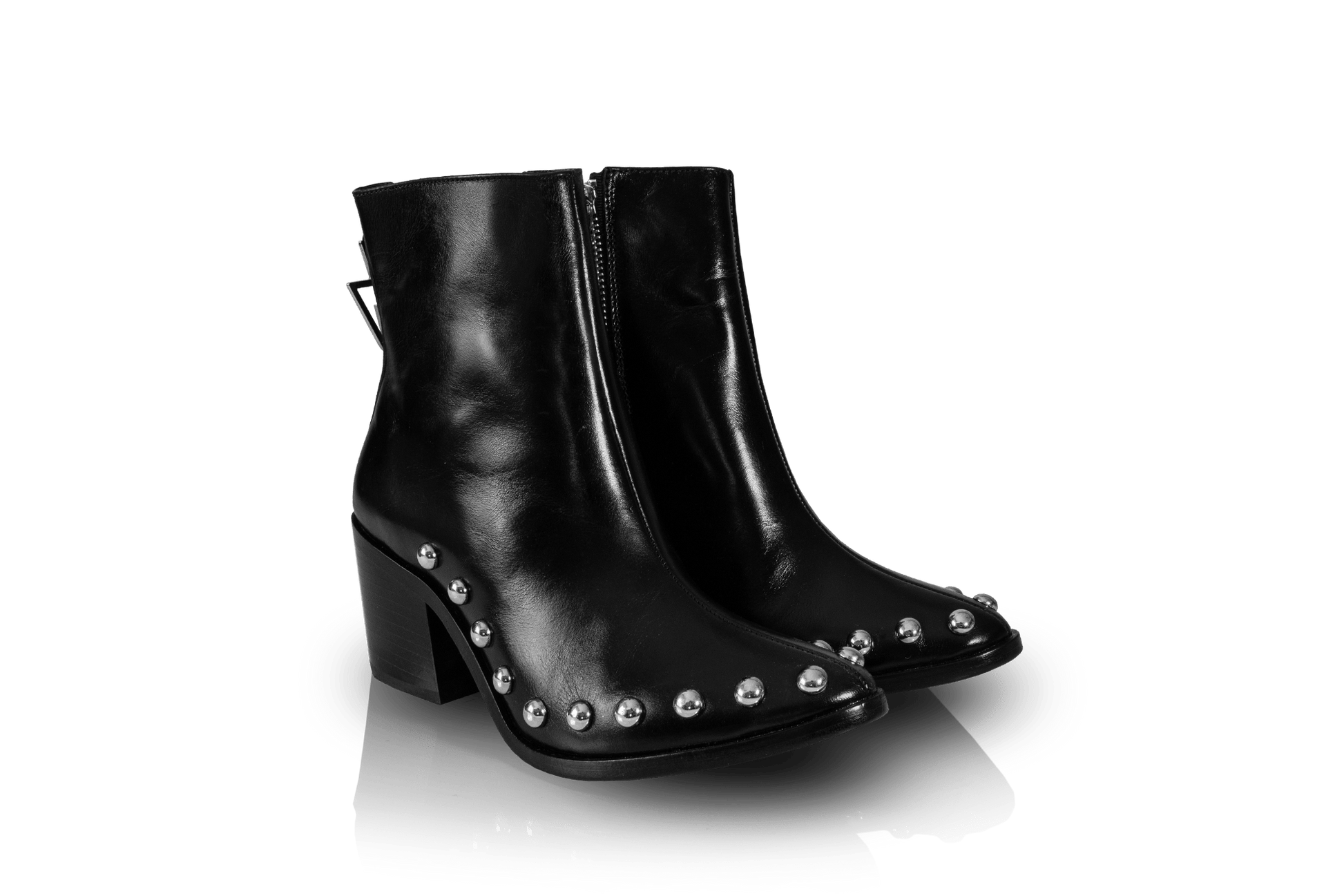* 100% black leather. Metallic zipper (internal view). Silver-colored studs and hardware. Compressed leather sole and heel. Handmade in Mexico.