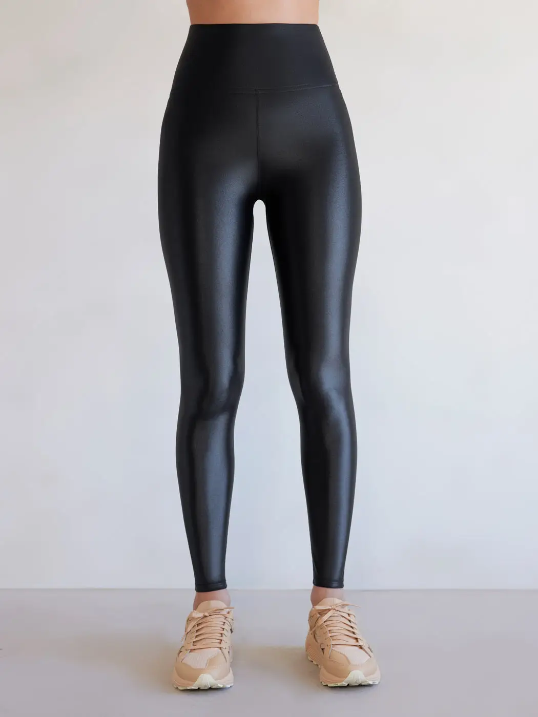 The High Rise Full-Length Legging in Takara Shine in Black from Carbon38, is the ultimate luxe performance piece. A glossy liquid finish adds style and an aesthetic edge for a sleek look that transitions effortlessly.