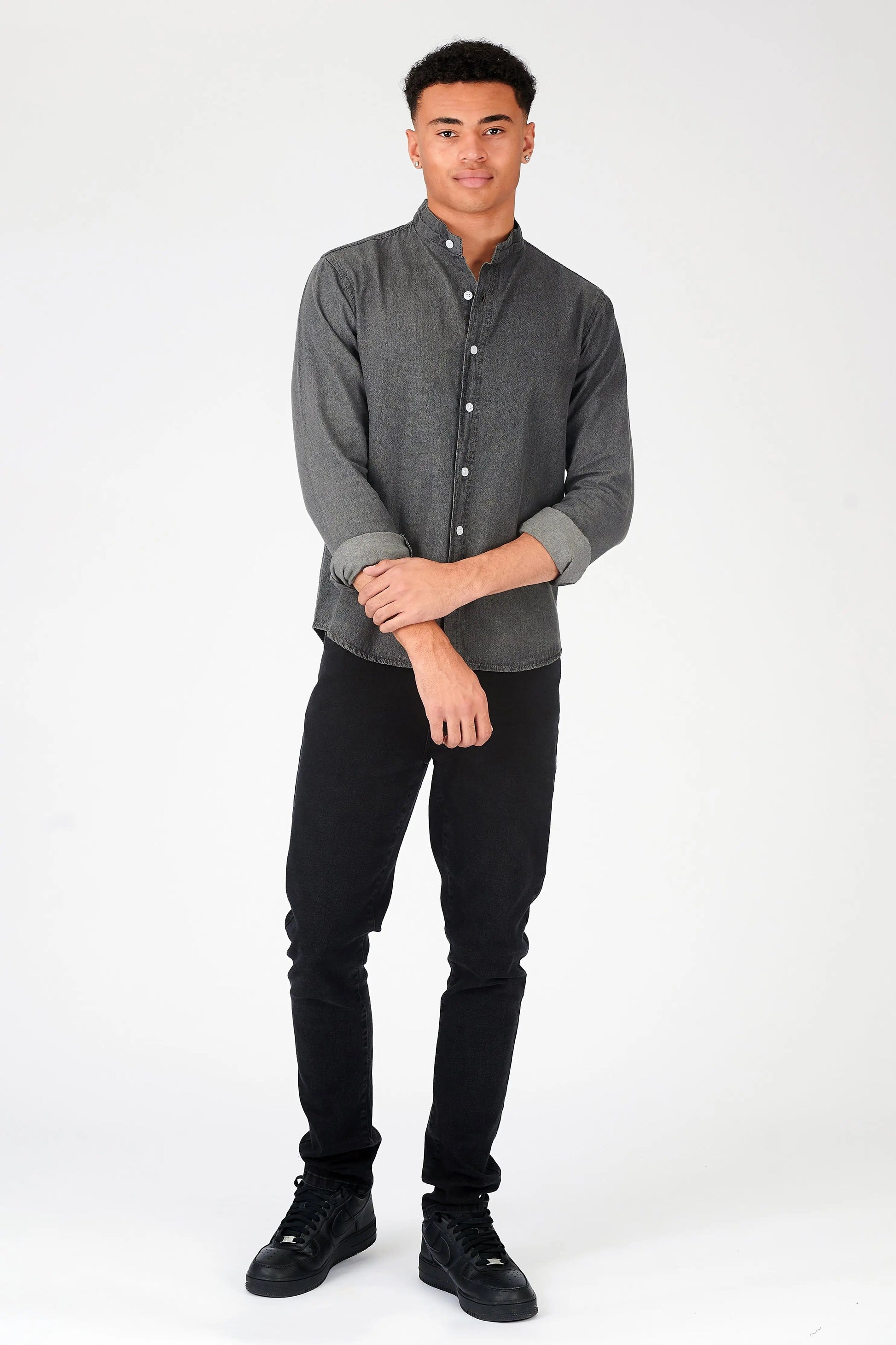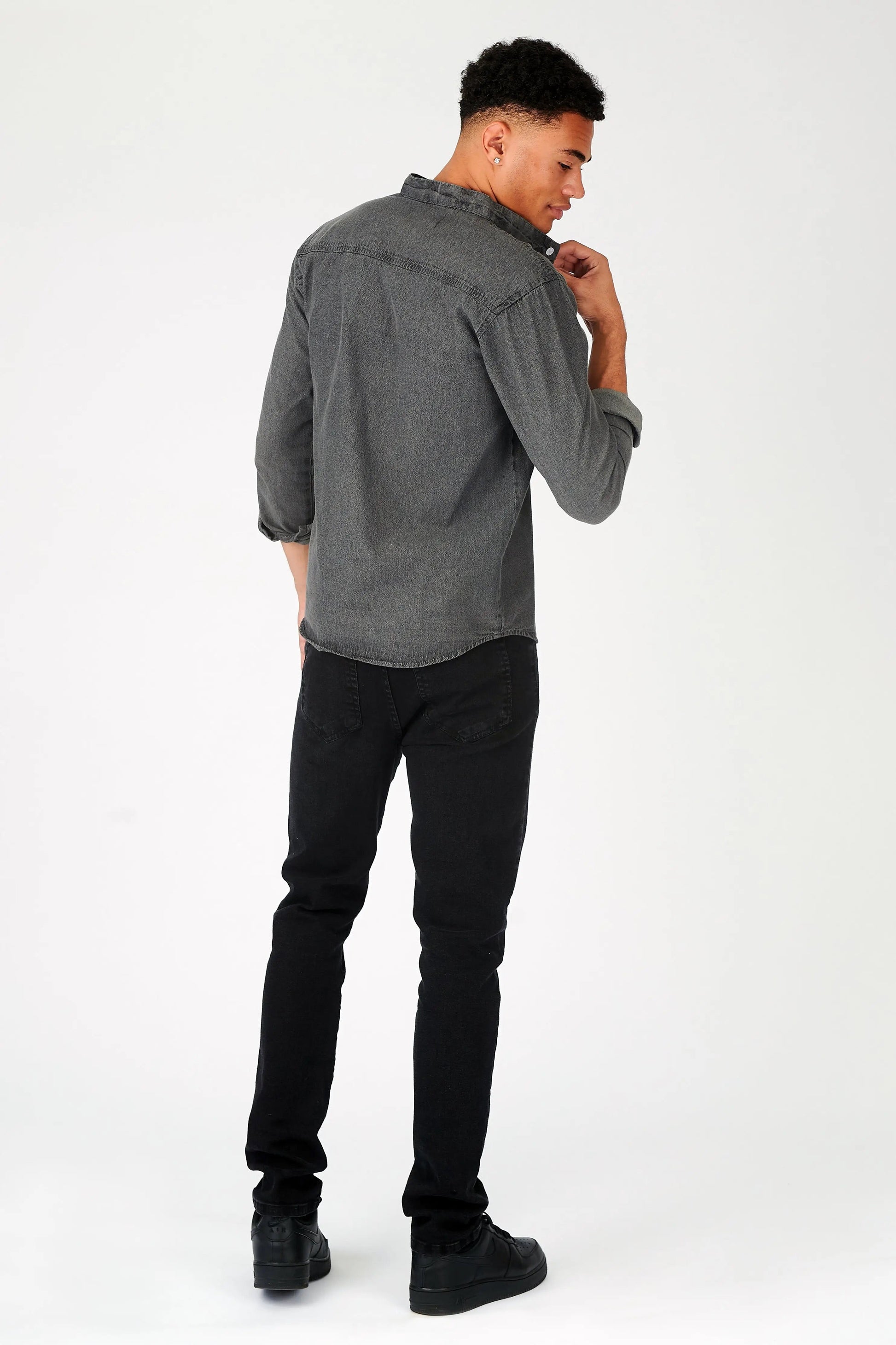 Looking for a stylish and versatile addition to your wardrobe? Look no further than our slim-fit denim shirt. Made of grey denim fabric, this shirt is perfect for dressing up or down. With a classic grandad collar and button-front fastening, it’s sure to become a go-to piece in your wardrobe. Whether you wear it with jeans or dress it up with chinos, the denim shirt is a must-have for any man’s wardrobe.