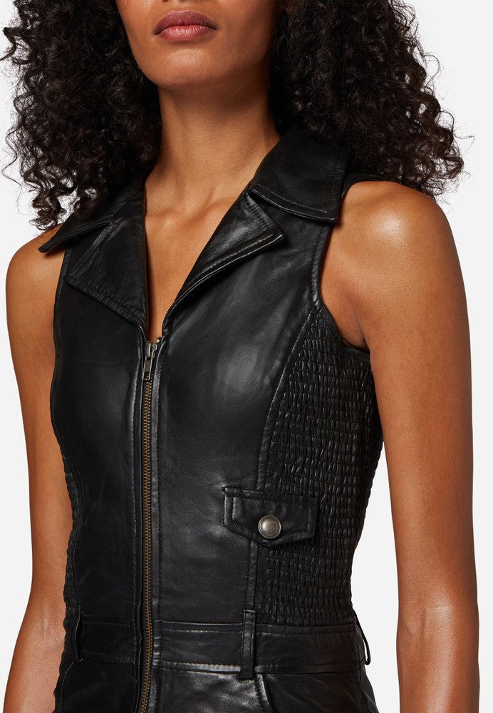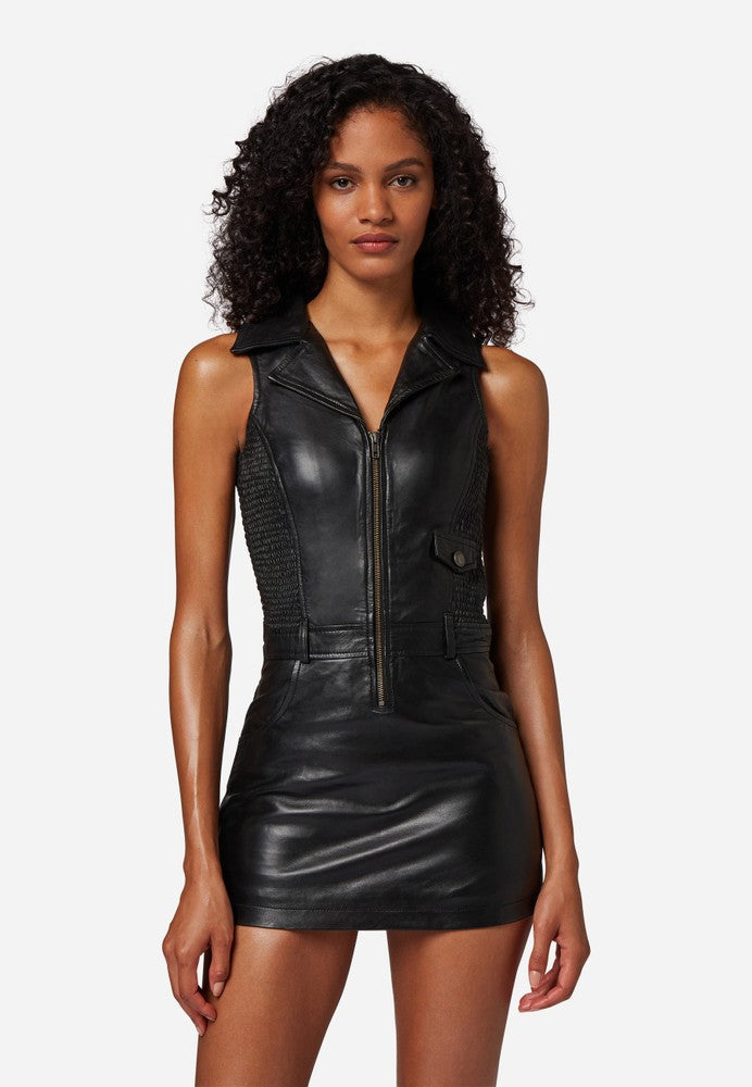 Typical elements of the classic motorcycle leather jacket and give the dress its rock look. The smocked leather on the sides, the decorative patch pocket with metal buttons and the side pockets, perfectly round off the biker design of the dress.