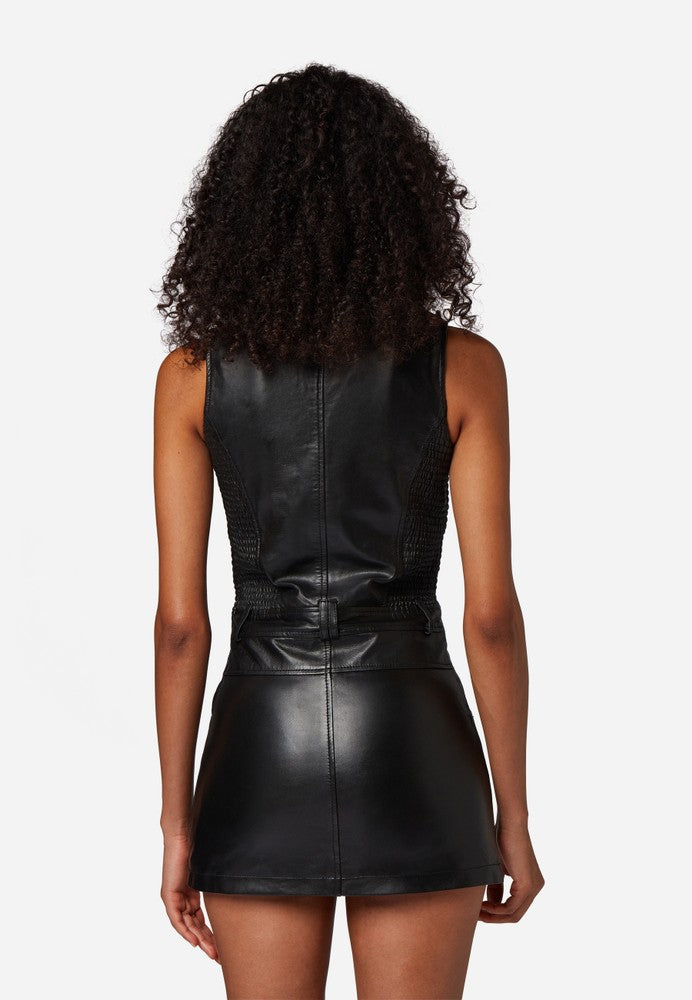 The mini dress burlesque provides cool design, sexy cut and perfect fit. Supple material made of buttery soft lamb leather provides figure-hugging cut of the dress skillfully emphasizes your waist and brings your curves to the forefront.