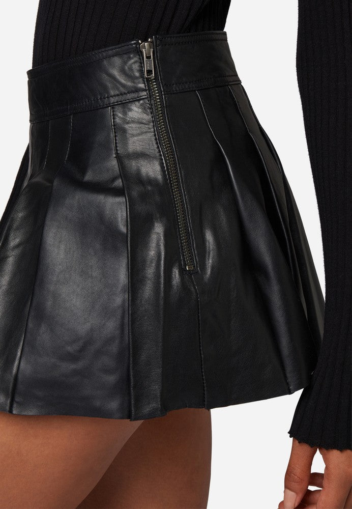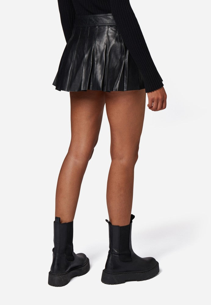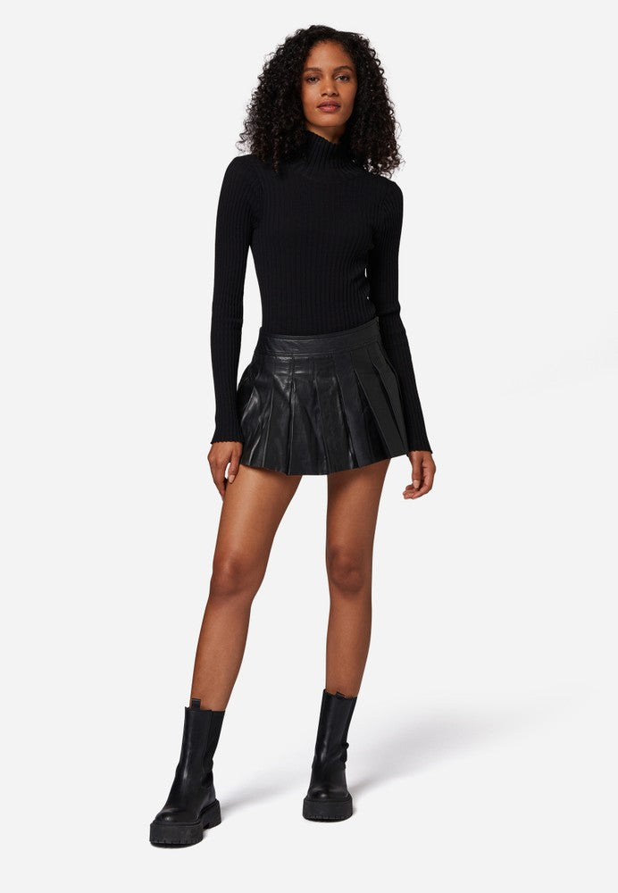 The leather mini pleated skirt presents itself with a normal waist, slightly flared cut and a high-quality upper material made of butter-soft lamb nappa leather.