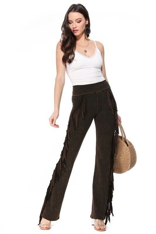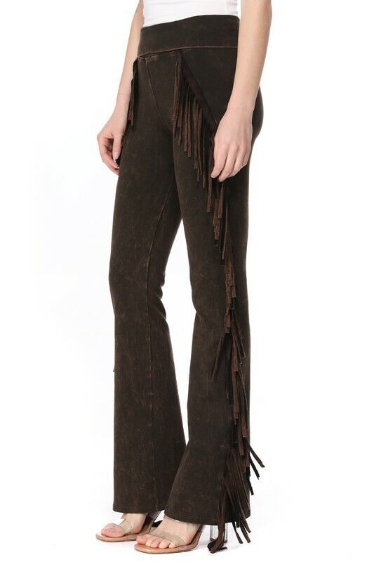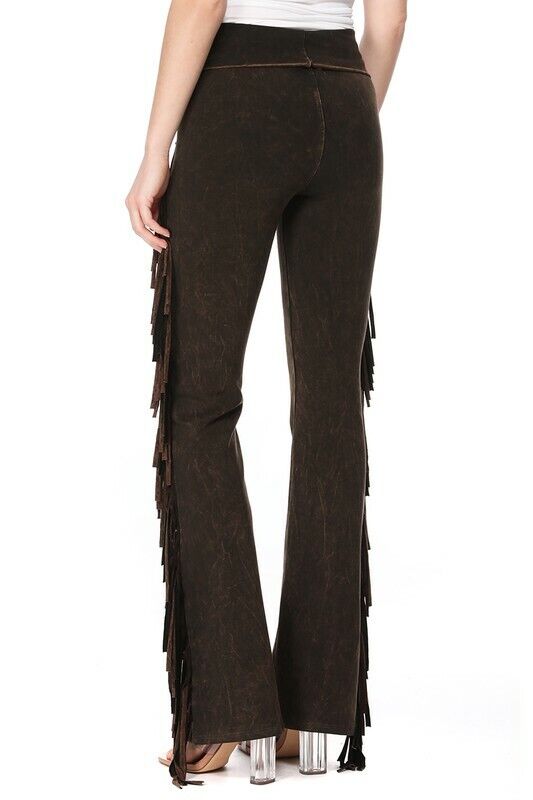 T-Party Mineral Wash Side Fringe Yoga Pants - Brown