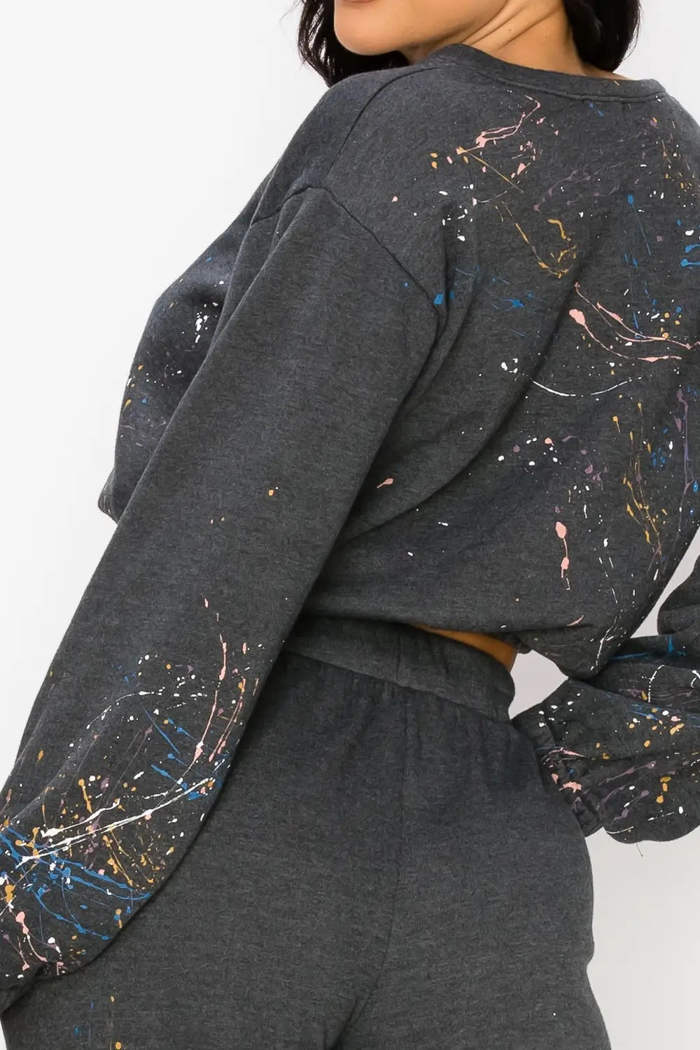 T-Party Splatter Paint Crop V Neck L/S Top - Black